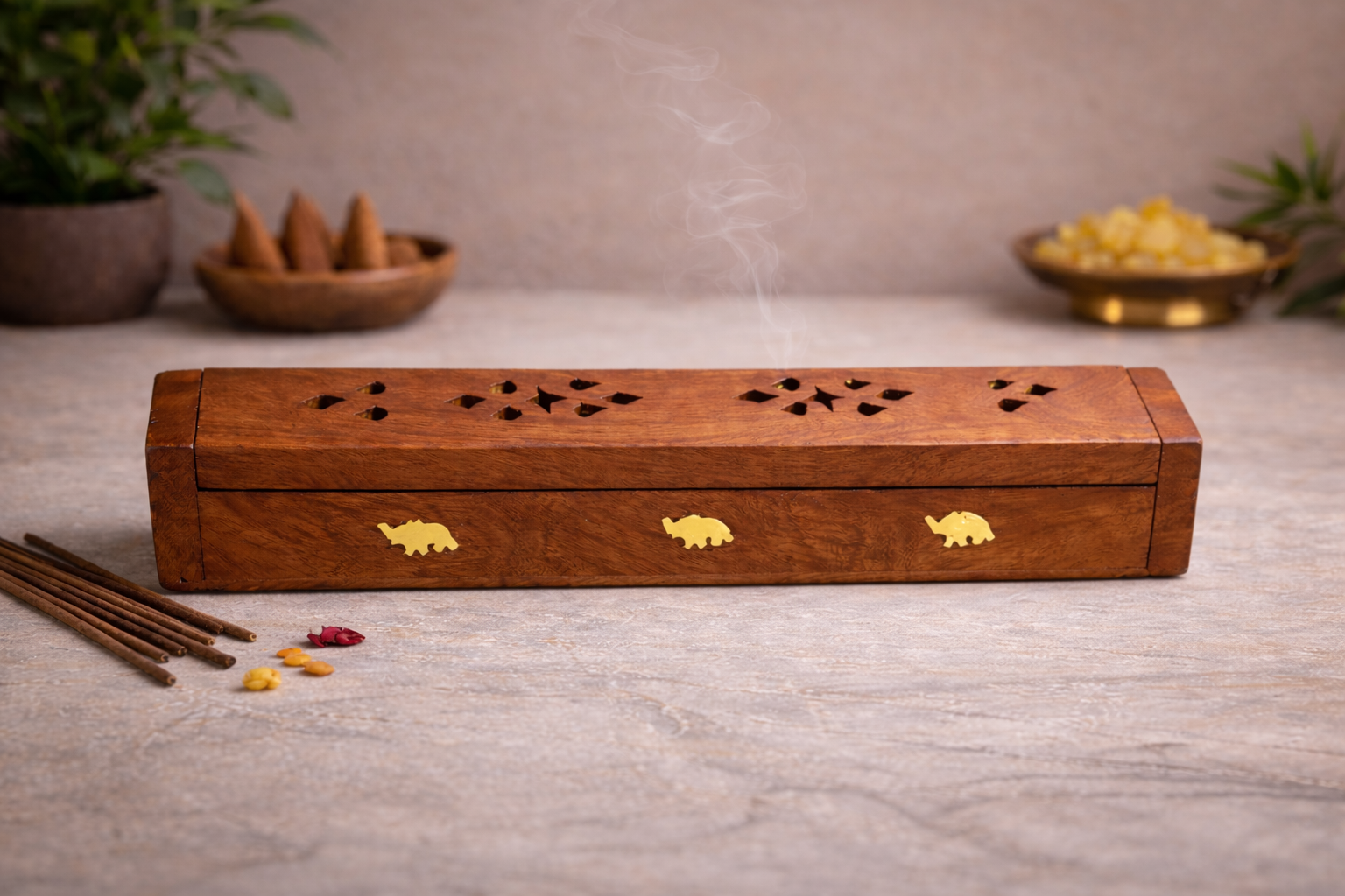 A decorative wooden incense burner that suits mandir décor, festive setups, spiritual rituals, aromatherapy and premium gifting.