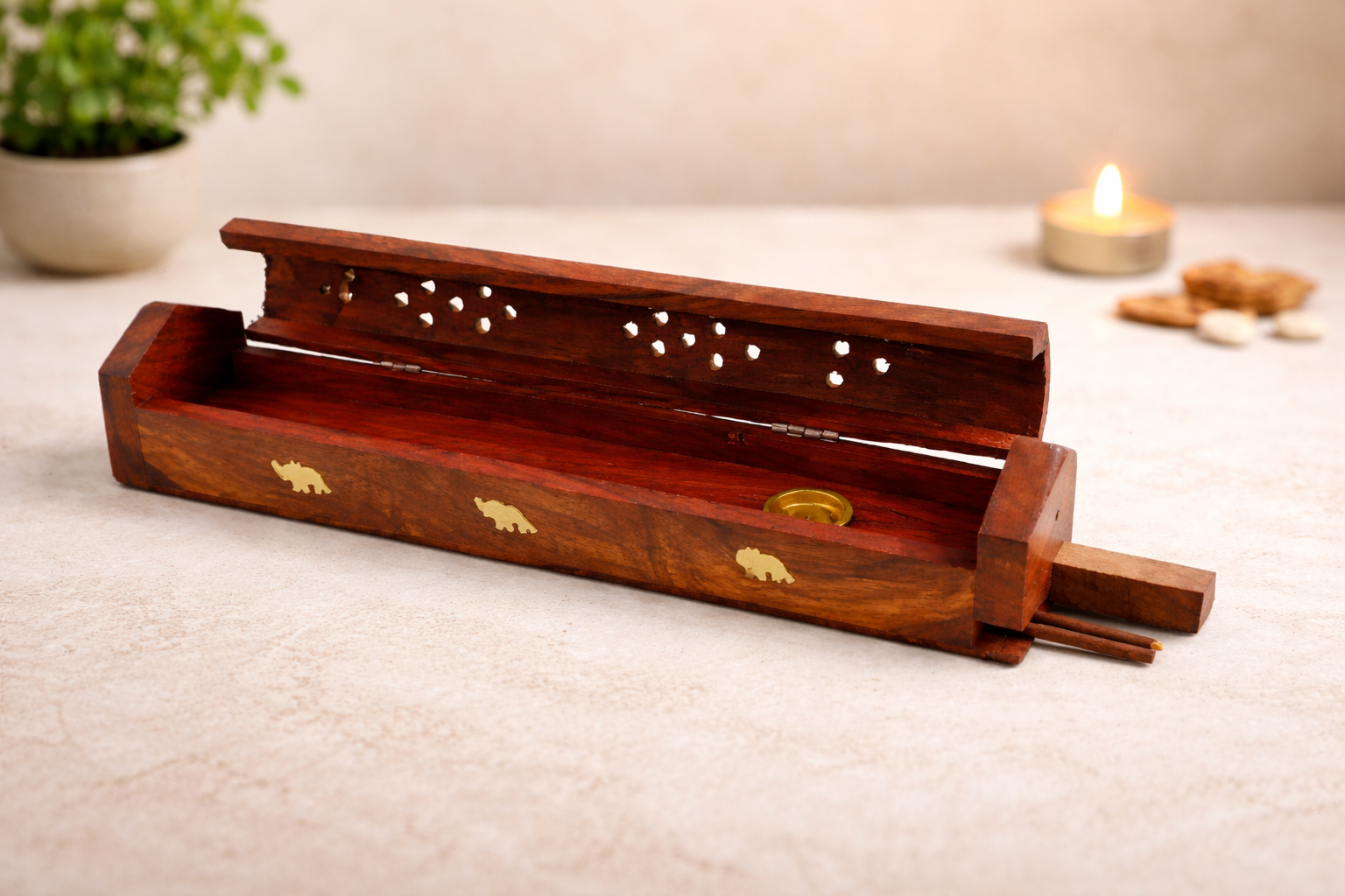Dual-purpose agarbatti box for burning and storing incense sticks — ideal for home temple, yoga studio, office and travel.